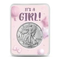 For first birthdays, we purchase coins in “It’s A Boy” and “It’s A Girl” clamshell cards. These honor new daughters, granddaughters, or great-granddaughters, and sons, grandsons, or great-grandsons. The “It’s A Boy” card features blue hues with baby shoes, rockets, and stars, while the “It’s A Girl” card has pink shades with stars, bows, and a hot-air balloon.